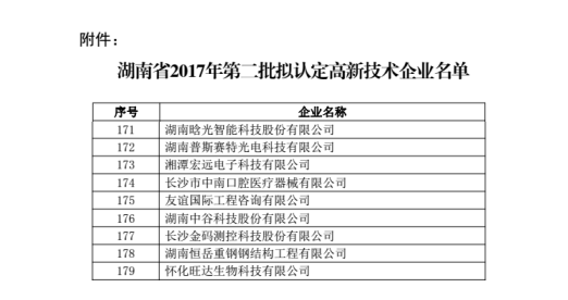 2017年12月1日,湖南省高新技術企業認定管理工作網公布了關于公示湖南省2017年第二批擬認定高新技術企業名單的通知,湖南晗光智能科技股份有限公司位列其中。